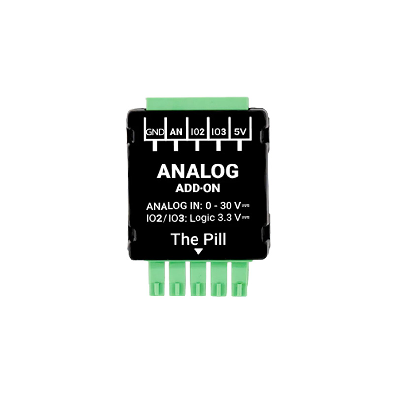 Measures analogue sensors and DC voltages up to 30 V. Extends the voltage measurement capabilities of The Pill to support analogue sensors and batteries with voltages up to 30 V. Suitable for popular analogue sensors in the 0–5 V range, as well as battery monitoring for 4.2 V, 12 V, and 24 V systems.