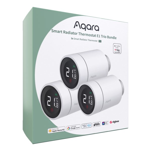 This bundle included 3 Aqara Radiator Thermostat E1. The Radiator Thermostat that can be used with the majority of water radiators* such as space heaters, towel warmers or even warm floors. Takes the readings from external Aqara sensors and adjusts the heating power according to them.