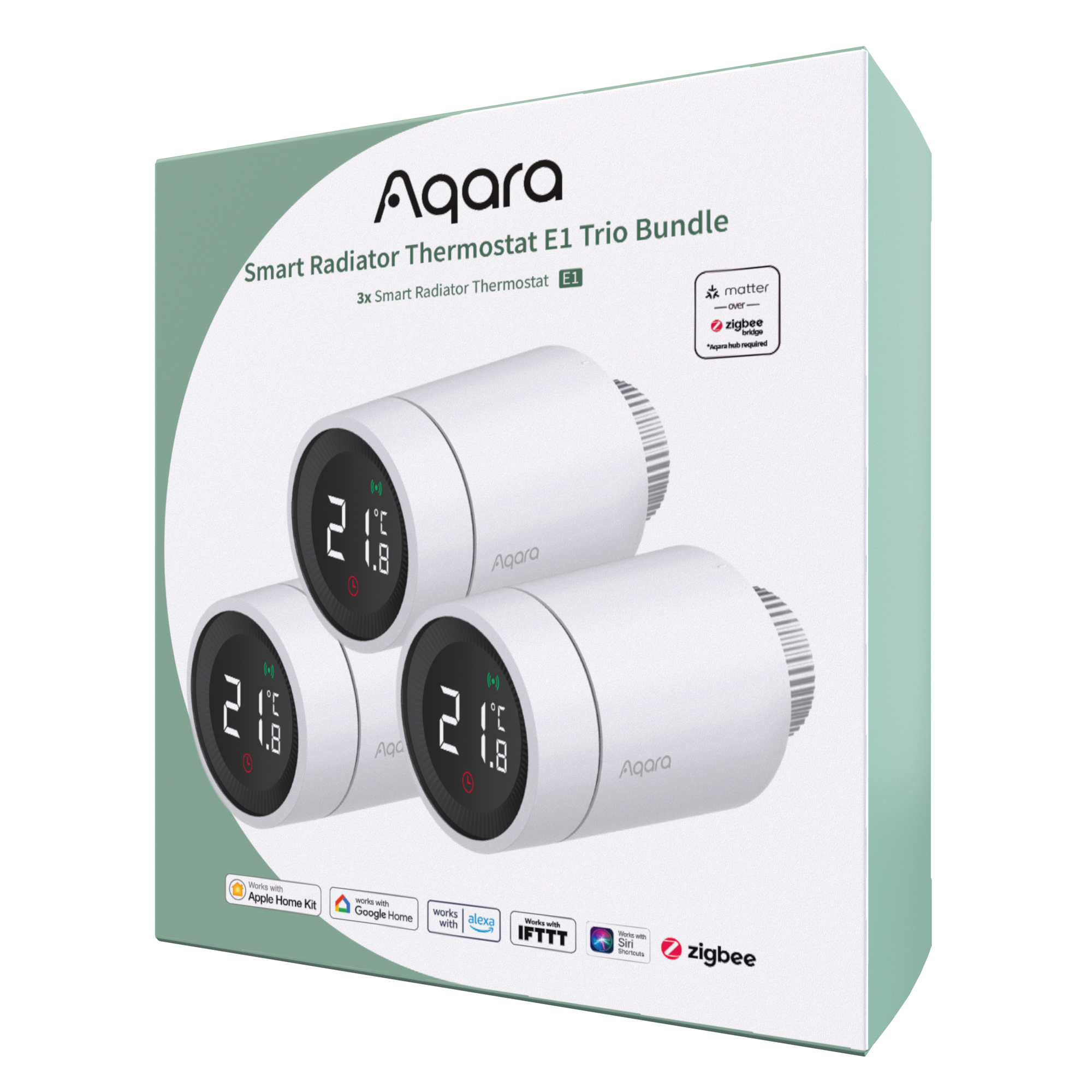 This bundle included 3 Aqara Radiator Thermostat E1. The Radiator Thermostat that can be used with the majority of water radiators* such as space heaters, towel warmers or even warm floors. Takes the readings from external Aqara sensors and adjusts the heating power according to them.