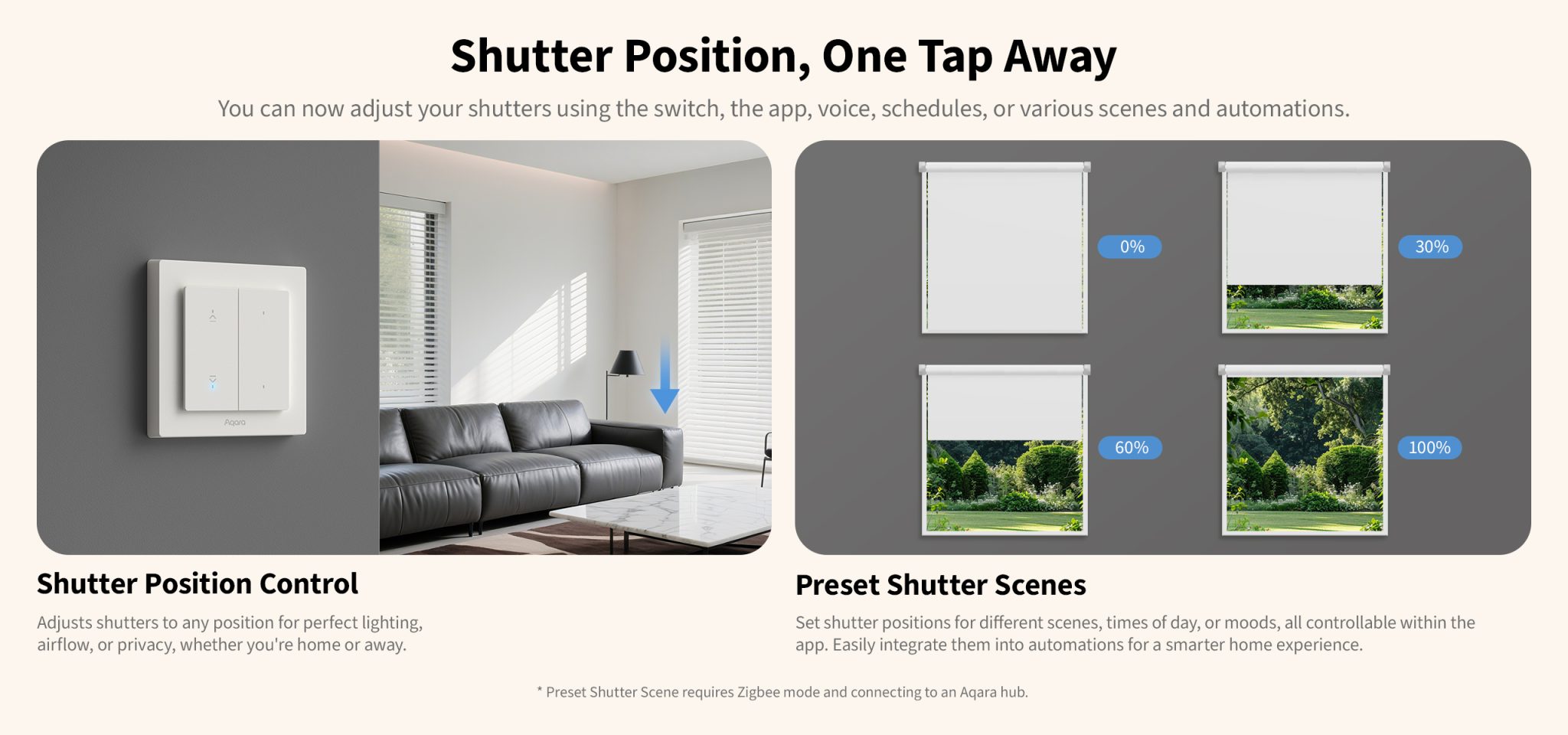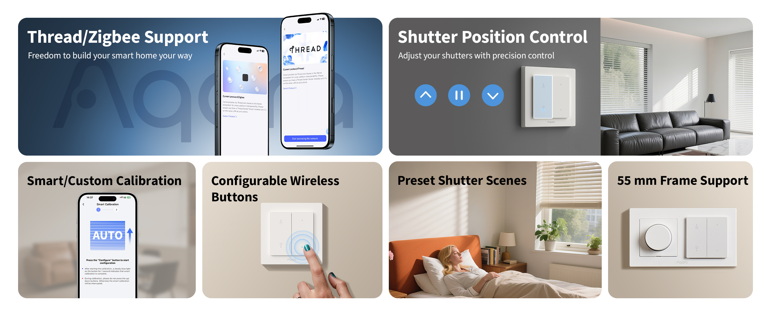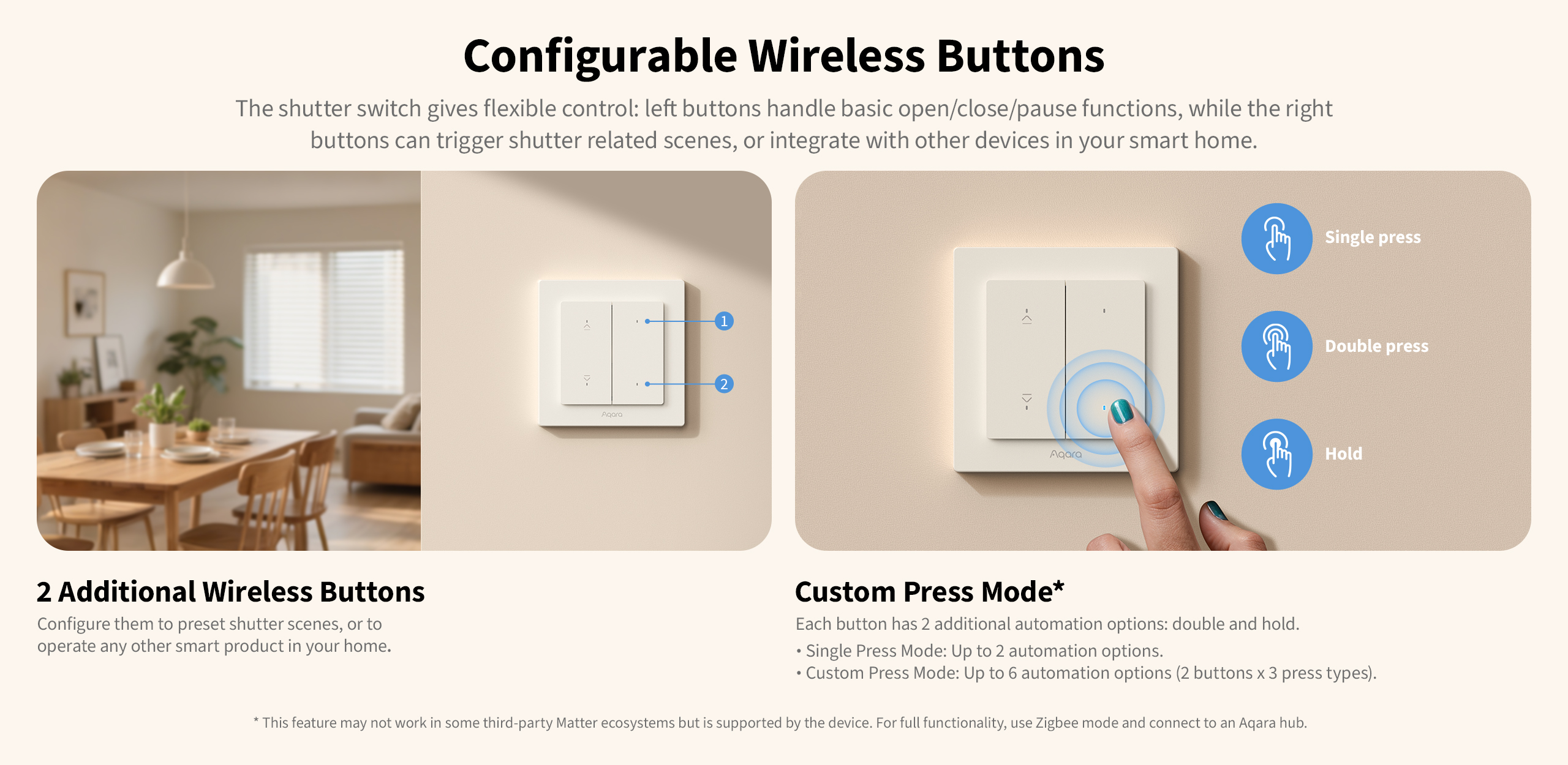 It only supports wiring to a compatible shutter motor, but the two wireless buttons on its right side can automate Aqara Light Switch H2 EU or other smart switches for lighting control.