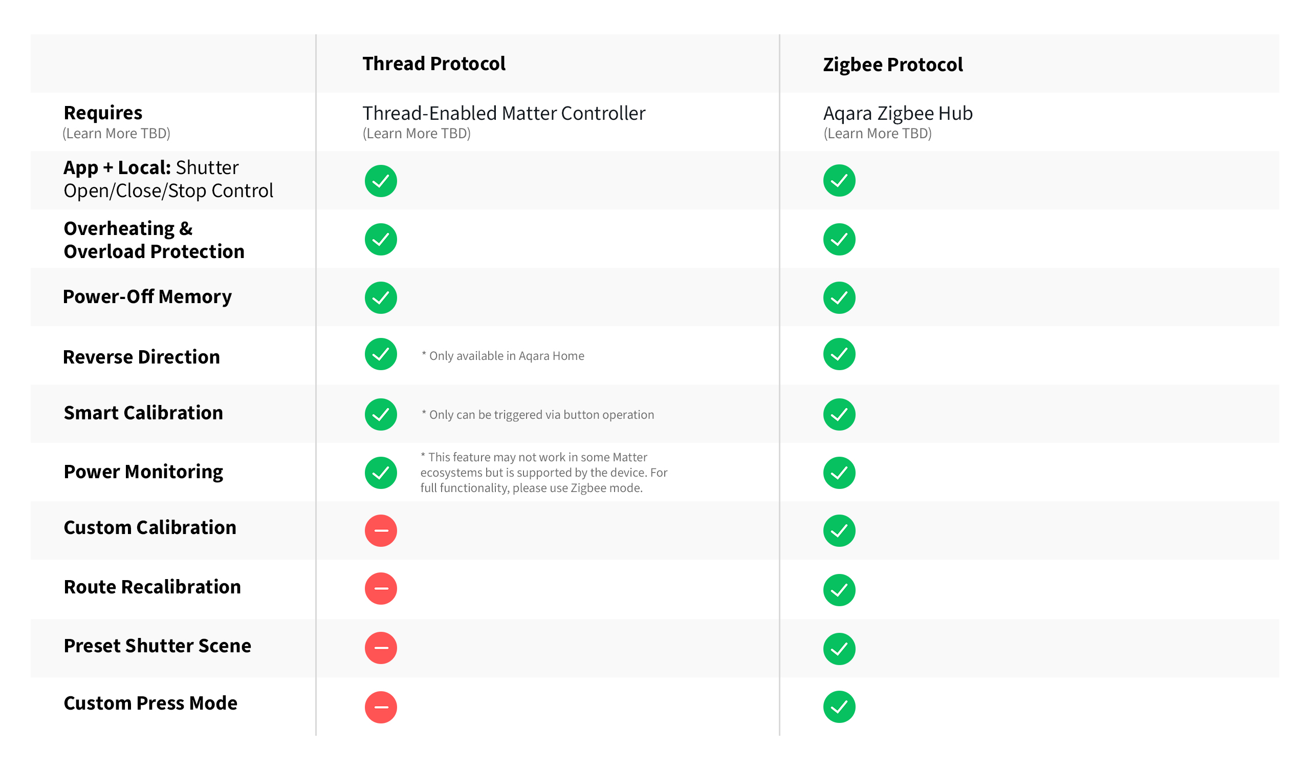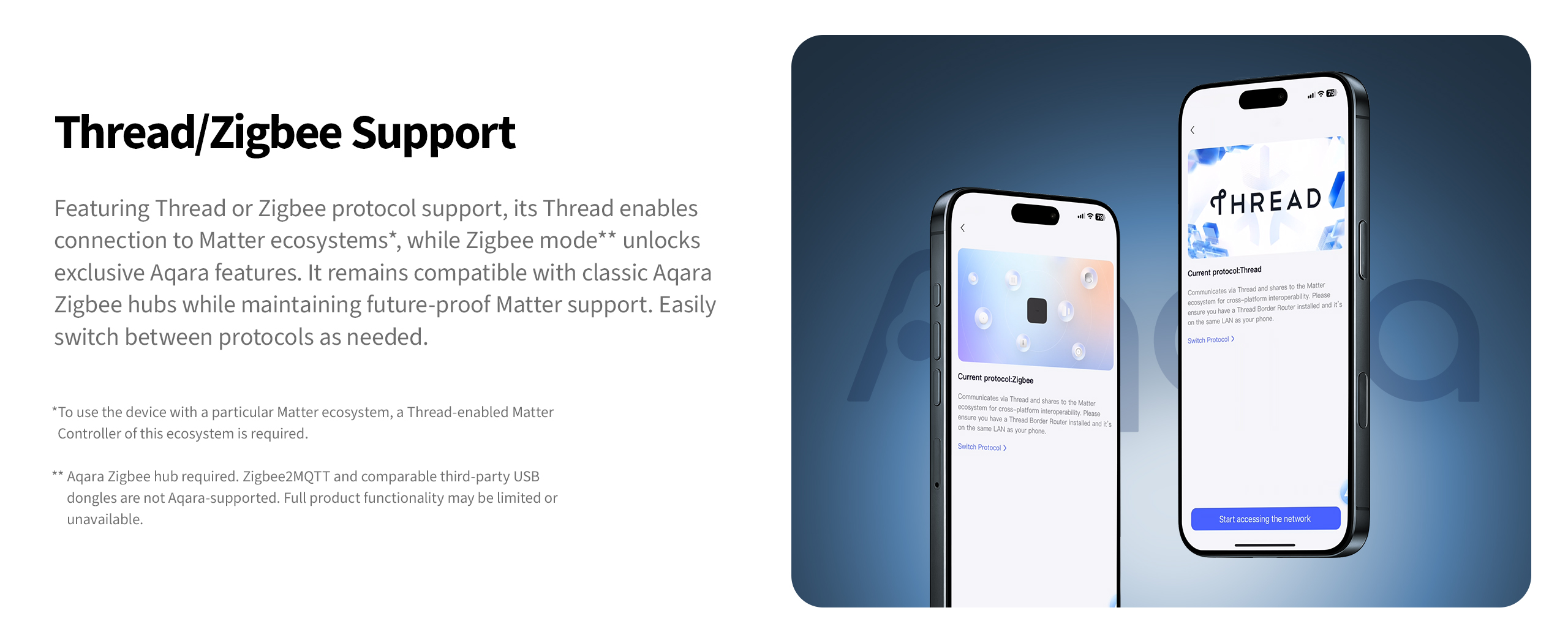 - Thread/Zigbee Support: The device features dual protocol support. In Thread mode, no Aqara hub is required to connect to third-party Matter ecosystems①, while Zigbee mode② unlocks exclusive Aqara features and ensures backward compatibility with the classic Aqara Zigbee hubs without compromising Matter support. The flexible protocol switching lets users enjoy Matter integration or Aqara’s advanced functionalities based on their preference.