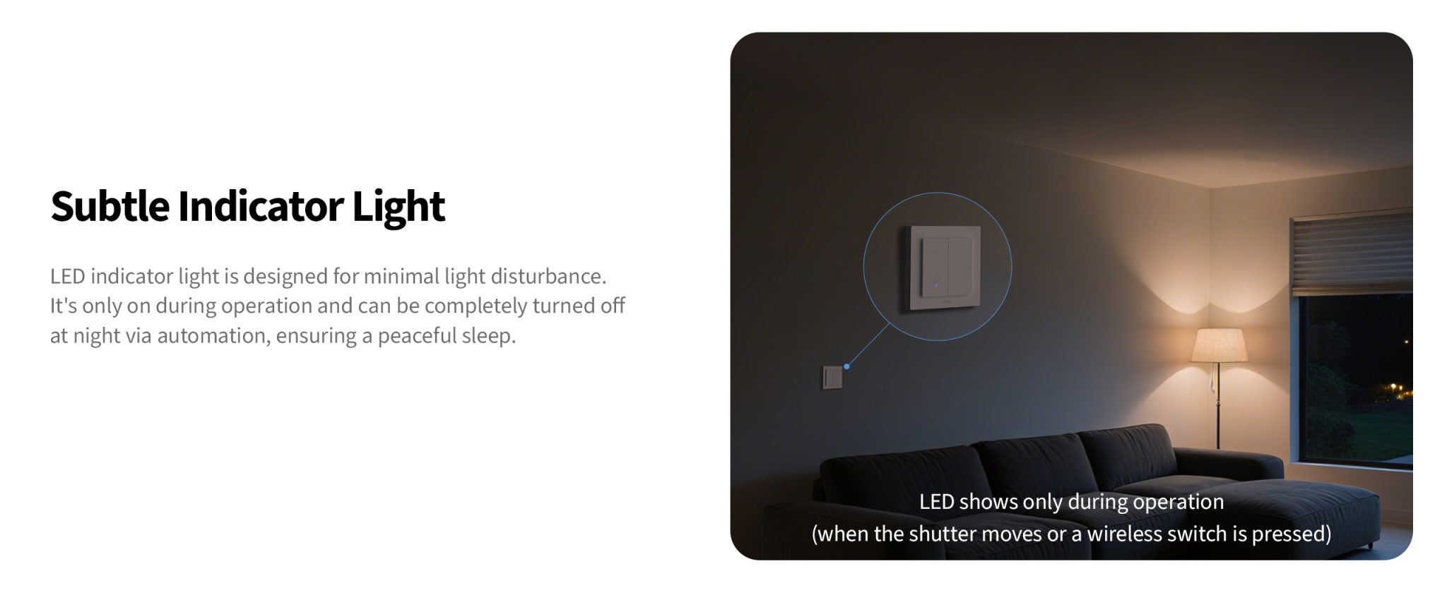 - Exclusive Wireless Buttons④: Beyond basic open/close/pause control via the left button, the right button gives you precise control over how much light enters your space—helping you create the perfect ambiance for work, relaxation, or sleep. Users can trigger smart home scenes and automations, letting you personalise your environment routines with a single tap.