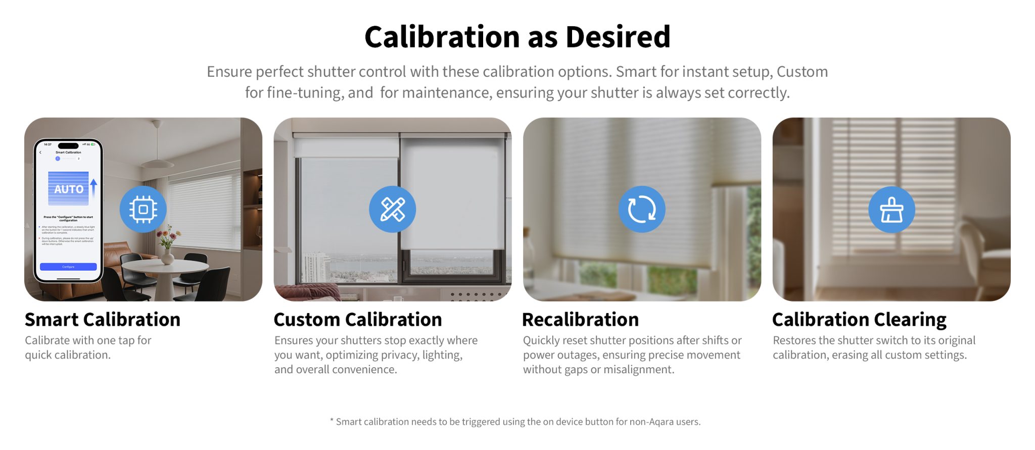 - Calibration③ as Desired: Achieve precise shutter control with calibration options tailored to your needs—Smart Calibration for effortless initial setup, Custom Calibration for personalised precision, and Route Recalibration for long-term accuracy. Whether you want a quick, hands-free setup or fine-tuned adjustments, these options ensure your shutters always move exactly as expected.