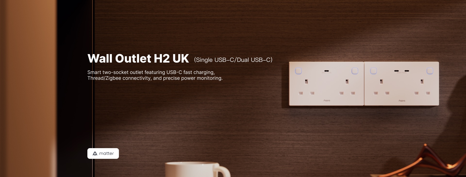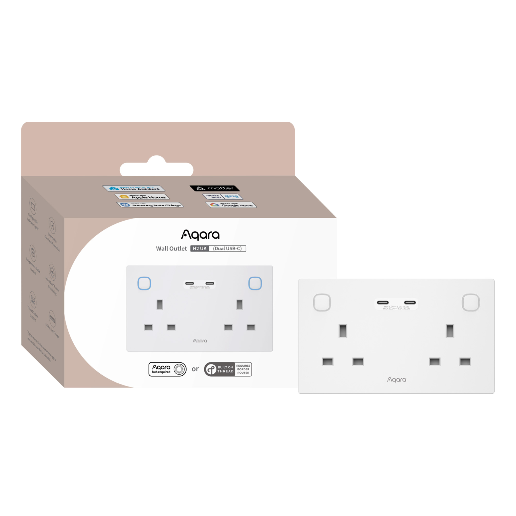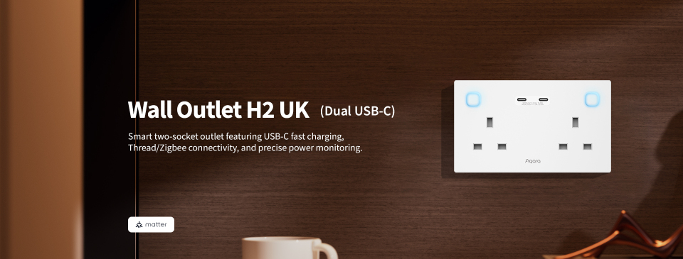 Smart Aqara Wall Outlet H2 (UK) with dual USB-C fast charging, Thread/Zigbee support, independent control, and power monitoring for safer, smarter home energy.